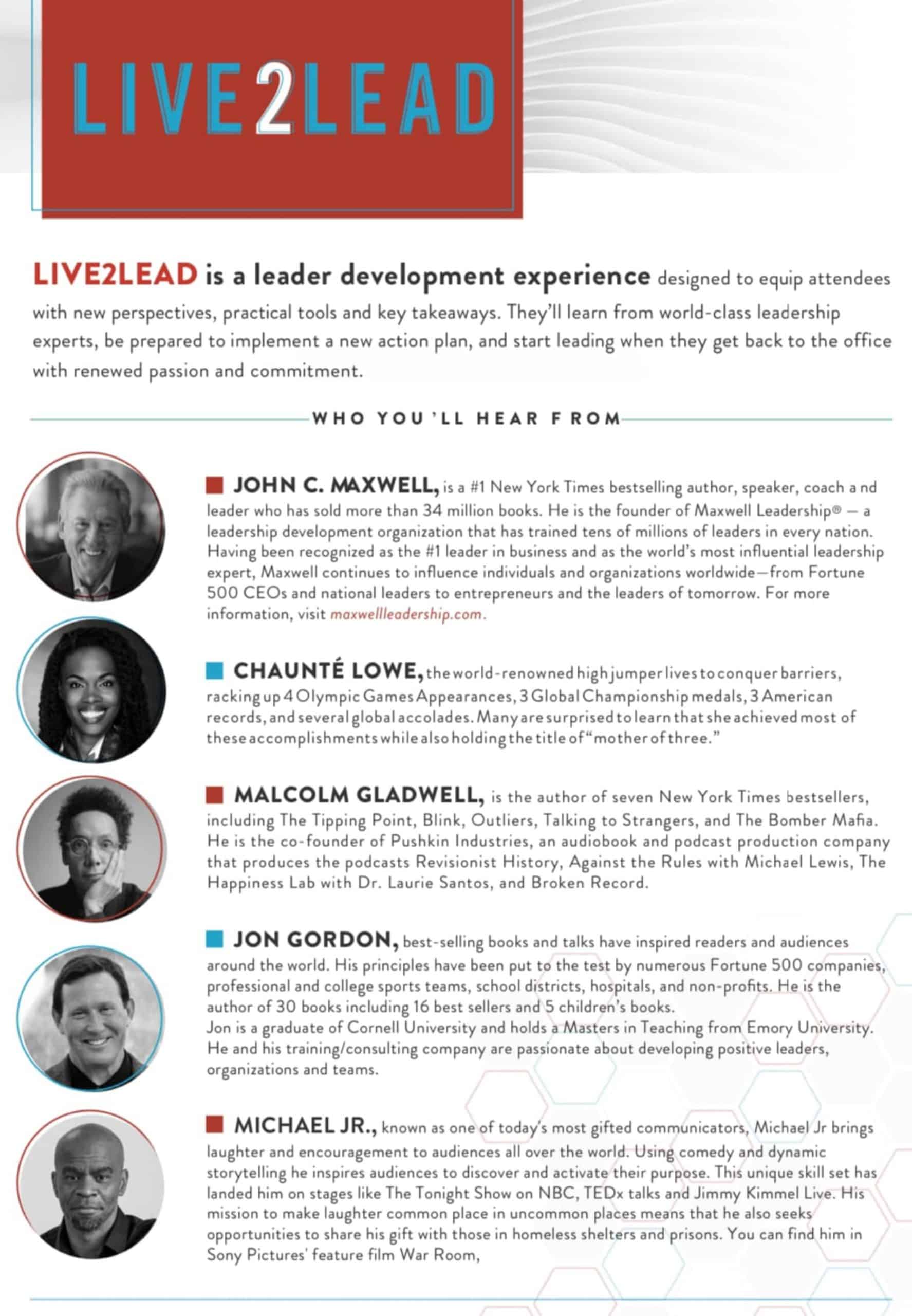 Maxwell, Jon Gordon and Malcolm Gladwell are among the speakers for this year’s simulcast that features a half-day of learning, growth and inspiration. Live2Lead, which is expected to attract 200 participants, features a patriotic theme with a veteran tribute.