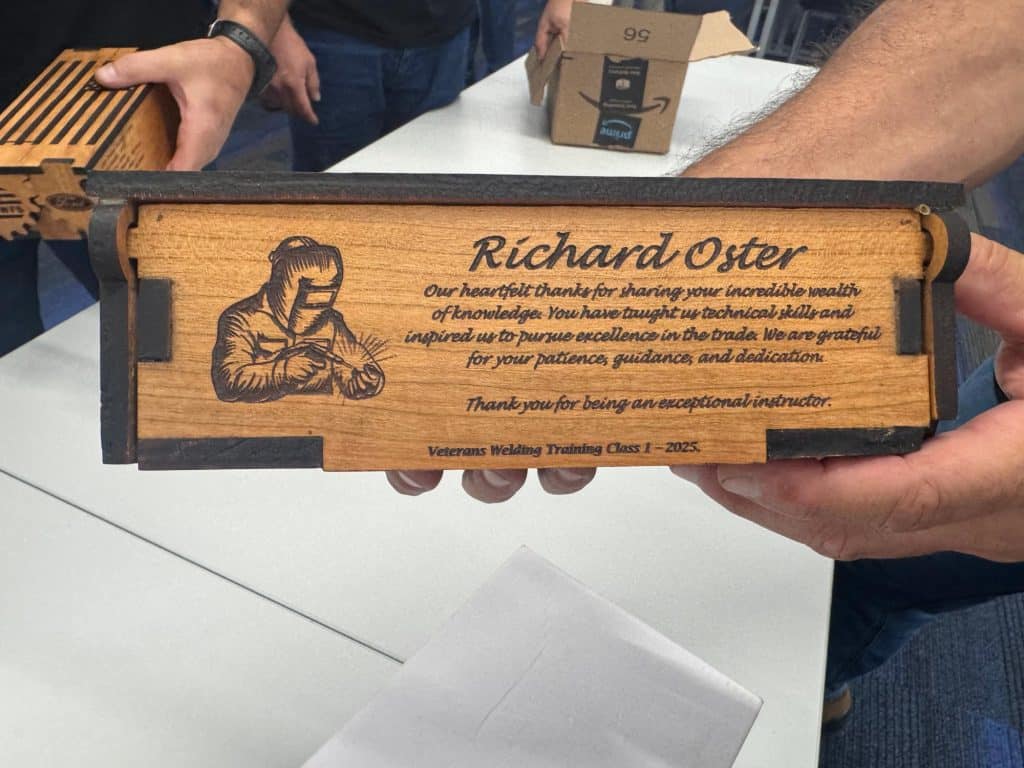 This class also decided to give back to their amazing team of instructors. The class had custom wood boxes made for each of the instructors. These had Ford, UAW, and WWFS logos burned into them as well as instructors name and a thank you message to each of them. Very classy gesture and well deserved for these trainers who spend weeks with each of them veterans to get them fully trained and certified in welding.